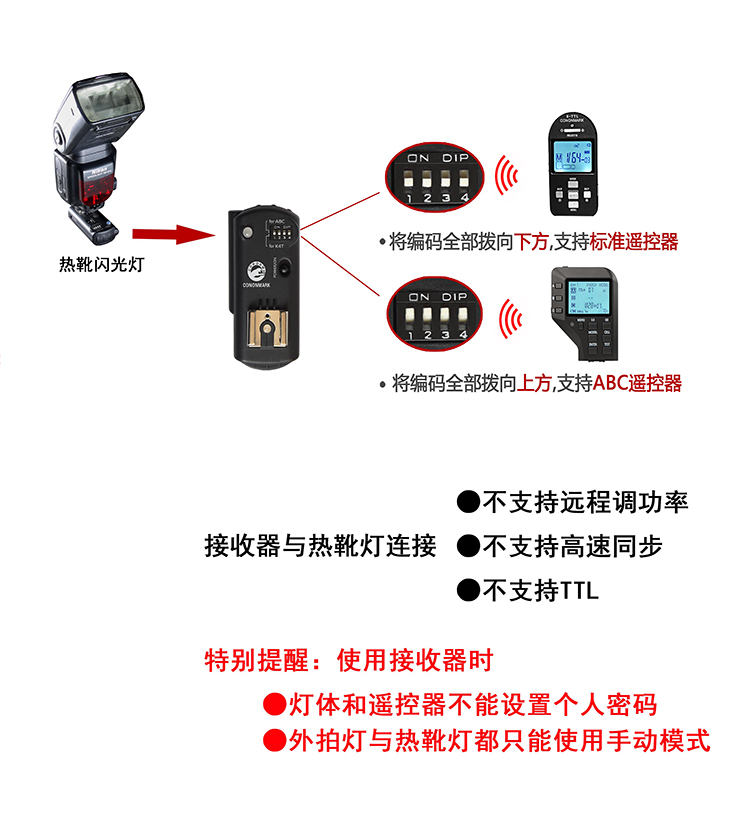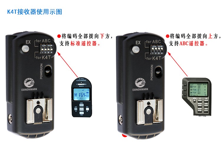 如果您有一支K4T/i6T,另有熱靴燈,可通過此接收器連接熱靴燈!需要注意的是,同時引閃K4T/i6T與熱靴燈時,只能使用M檔手動模式,熱靴燈參數(shù)需要手動調(diào)節(jié)。